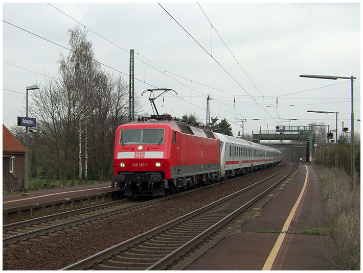 120 120 zieht einen IC nach Hamburg, der Steuerwagen hinter der Lok war offensichtlich nicht einsatzfähig |