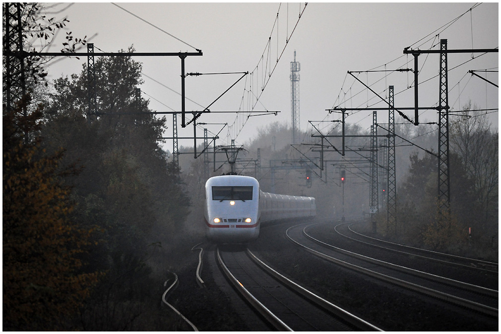 16:43 - Schon kurz nach Sonnenuntergang zieht dichterer Nebel durchs Tal, den auf dem letzten Bild des Tages ein ICE von Hamburg durchquert. |