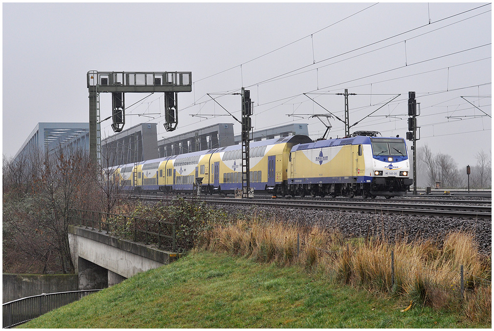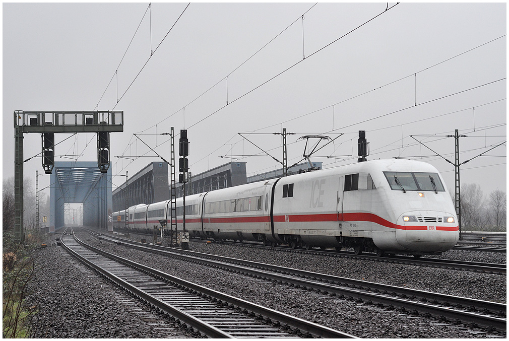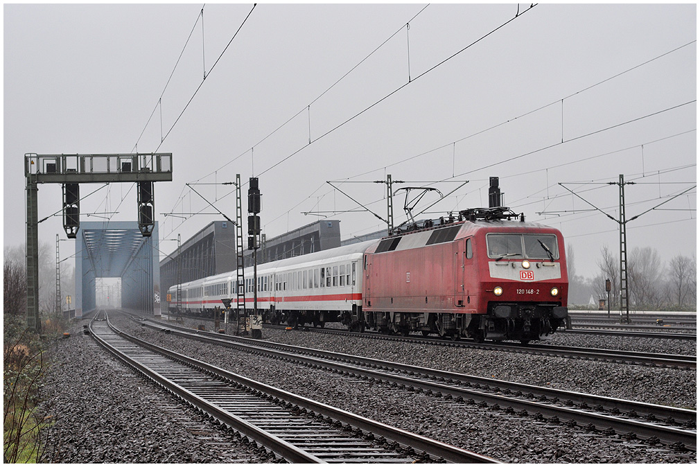 13:48 - 120 148 "kämpft" sich mit einem IC von Hamburg durch einen fieses Regen-Nebel-Gemisch über die Süderelbbrücken |