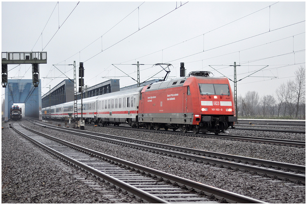 14:42 - Gerade ist 185 337 mit einem Gz Richtung Norden durch (letzter Wagen links), da kommt 101 103 mit einem IC über die Süderelbbrücken |