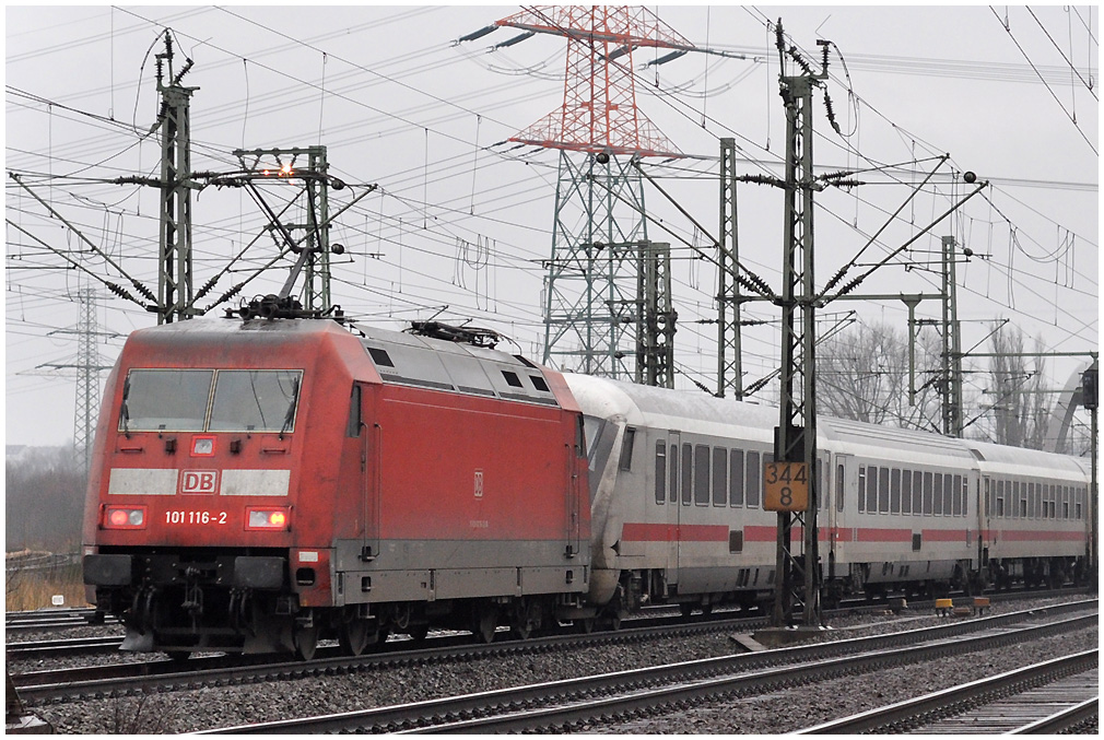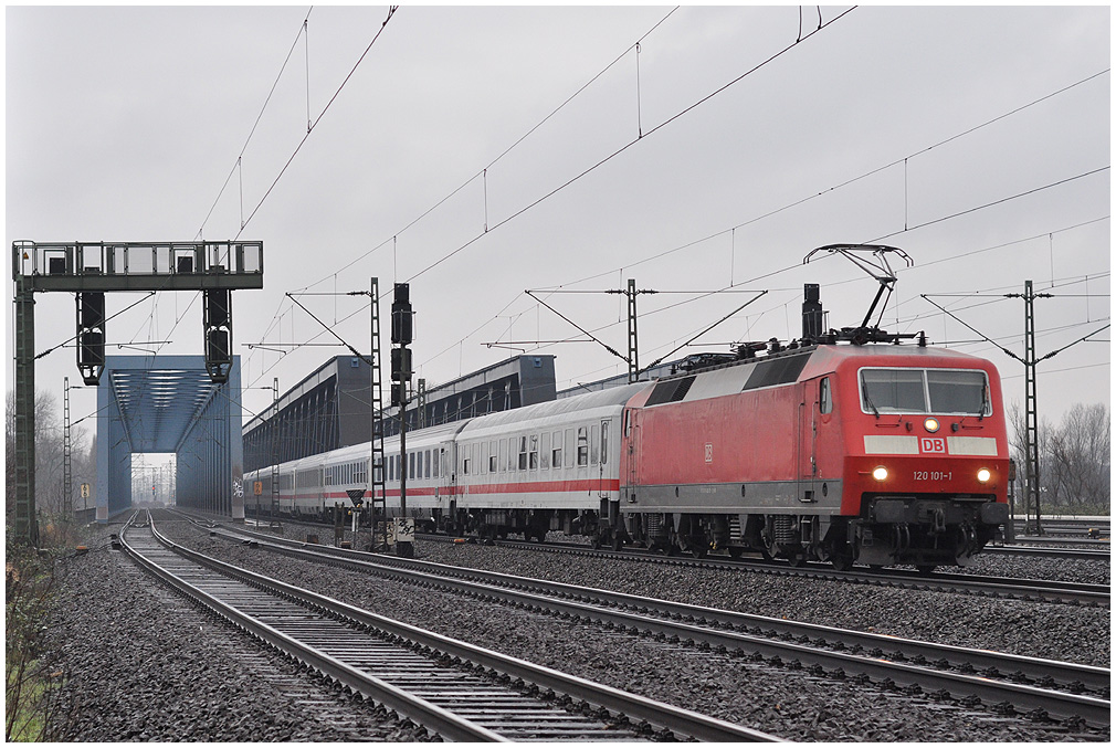 15:01 - 120 101 mit einem IC von Hamburg, hinten dran die am Stromabnehmer Funken sprühende 101 116 |