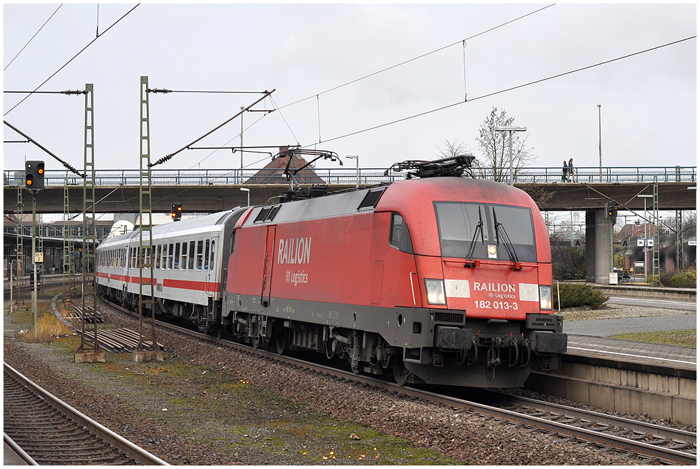13:12 - Mit +8 verlässt IC 1803 den Bf Harburg, es zieht die verliehene Railion 182 013. |