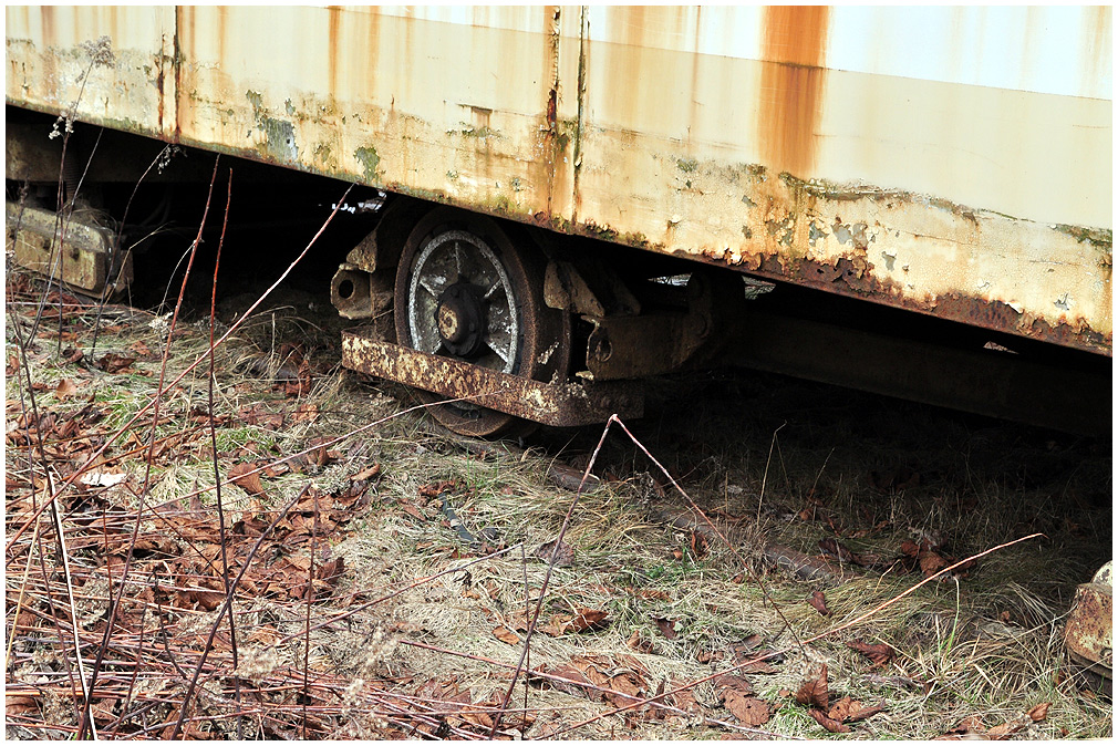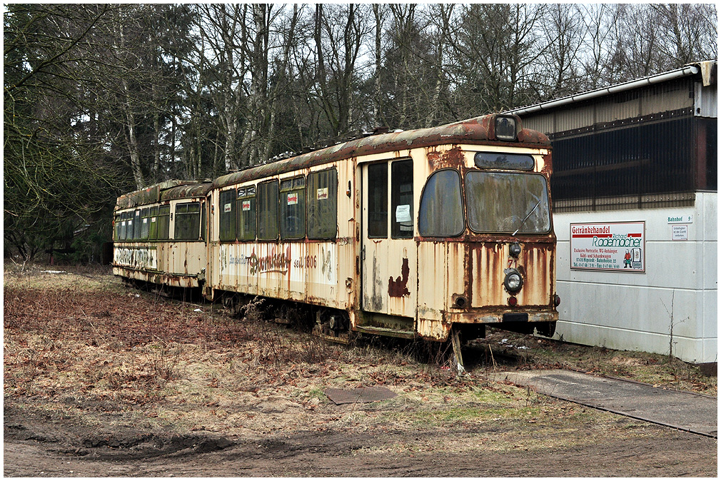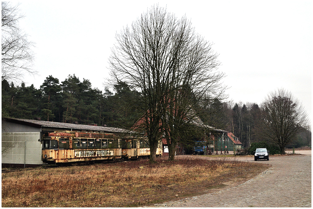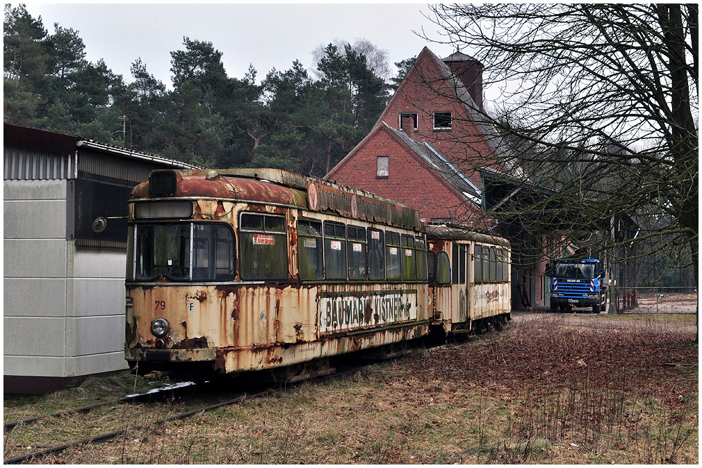 Zwei in Heinschenwalde abgestellte Straßenbahntriebwagen aus Bremerhaven, vorne Tw 71. |